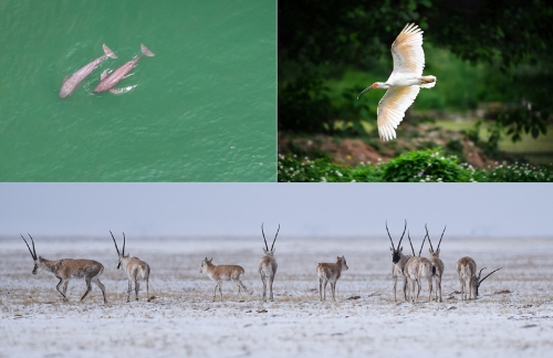 這是一張拼版照片:左上圖為在湖北省宜昌市江邊,長江江豚在水中嬉戲(無人機照片,新華社記者肖藝九5月11日攝);右上圖為陜西省漢中市洋縣朱鹮生態(tài)園內的朱鹮(新華社記者劉瀟5月13日攝);下圖為藏羚羊在三江源可可西里地區(qū)活動(新華社記者吳剛4月20日攝)。新華社發(fā)