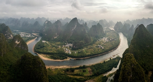 這是2018年10月18日拍攝的廣西桂林陽朔縣興坪鎮(zhèn)的漓江景色(無人機拼接照片)。新華社記者 李鑫 攝