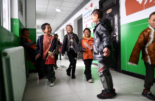 2021年3月26日,青海瑪多縣民族寄宿制中學二年級的學生在課間玩耍。該校目前采用清潔取暖方式,學生的學習和生活環(huán)境大為改善。新華社記者 張宏祥 攝