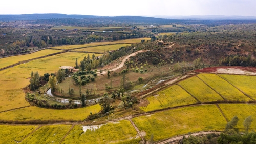 2020年9月26日拍攝的陜西省靖邊縣黃蒿界鎮(zhèn)馬季溝村稻田(無人機照片)。近年來,靖邊縣實施了“三北”防護林、退耕還林、流域治理等生態(tài)建設工程,北部沙漠區(qū)裸露明沙完全消失,中部農田林網蔚然成蔭,南部山區(qū)夏季綠色滿山。新華社記者 陶明 攝