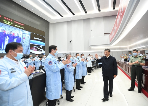 6月23日,中共中央總書記、國家主席、中央軍委主席習近平來到北京航天飛行控制中心,同正在天和核心艙執(zhí)行任務的神舟十二號航天員聶海勝、劉伯明、湯洪波親切通話。這是通話結束后,習近平向他們揮手致意,向現(xiàn)場參試人員表示慰問。新華社記者 燕雁 攝