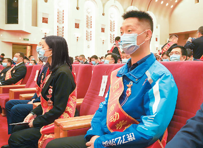 餓了么外賣(mài)小哥宋增光(前右)獲得“全國(guó)五一勞動(dòng)獎(jiǎng)?wù)隆薄?王鑫 攝(新華社發(fā))