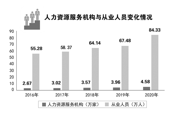 莫榮:人力資源服務(wù)業(yè)是生產(chǎn)性服務(wù)業(yè)和現(xiàn)代服務(wù)業(yè)的重要組成部分,對(duì)推動(dòng)人力資源有效配置、提升勞動(dòng)者素質(zhì)、促進(jìn)就業(yè)創(chuàng)業(yè)和助力經(jīng)濟(jì)高質(zhì)量發(fā)展具有重要作用。截至2020年末,我國(guó)共有各類人力資源服務(wù)機(jī)構(gòu)4.58萬家,全年為4983萬家次用人單位提供專業(yè)服務(wù),為2.90億人次勞動(dòng)者提供了就業(yè)、擇業(yè)和流動(dòng)服務(wù)。