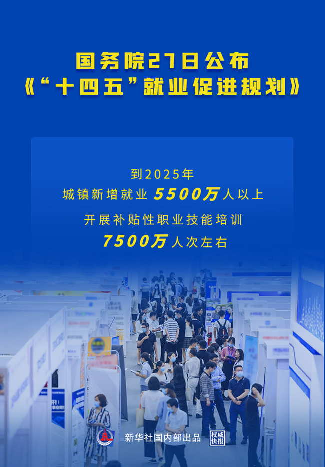 國務(wù)院27日公布的《“十四五”就業(yè)促進(jìn)規(guī)劃》首次明確,到2025年,城鎮(zhèn)新增就業(yè)5500萬人以上。