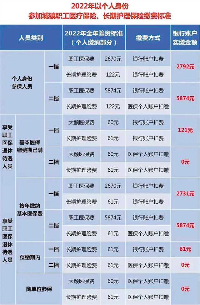 2021年12月30日,市醫(yī)保局印發(fā)了《關(guān)于2022年以個(gè)人身份參加城鎮(zhèn)職工醫(yī)療保險(xiǎn)、長(zhǎng)期護(hù)理保險(xiǎn)繳費(fèi)有關(guān)問(wèn)題的通知》,并就市民關(guān)心的問(wèn)題進(jìn)行解讀。據(jù)悉,2022年以個(gè)人身份參加職工醫(yī)保的繳費(fèi)標(biāo)準(zhǔn)保持去年不變,一檔繳費(fèi)標(biāo)準(zhǔn)為2670元/年·人,二檔繳費(fèi)標(biāo)準(zhǔn)為5874元/年·人。