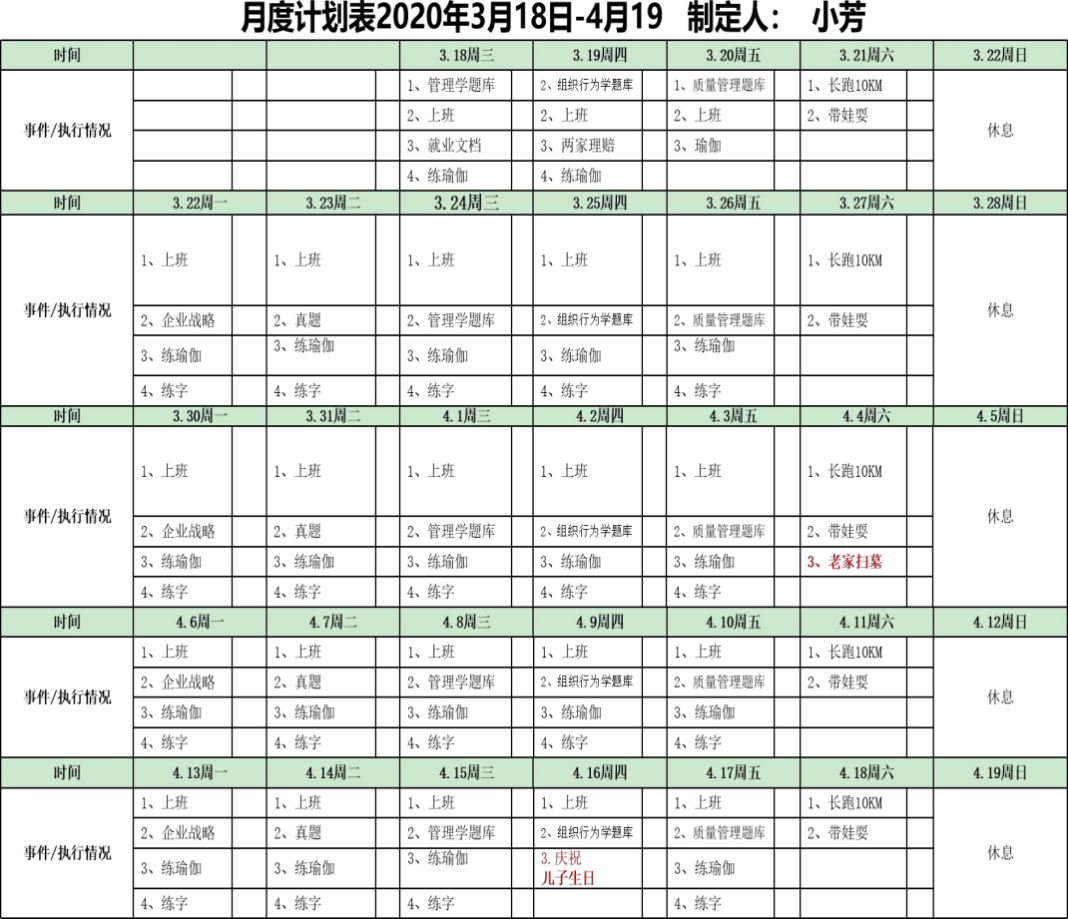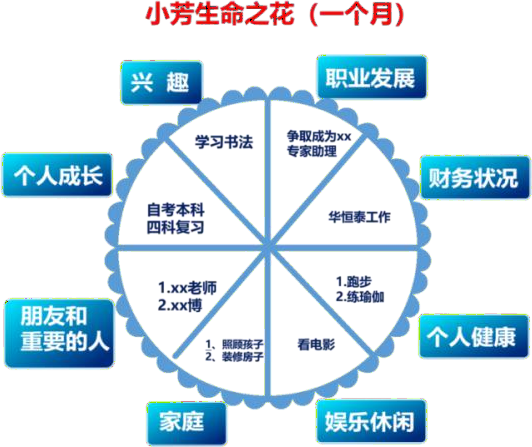 從她的現(xiàn)實餅圖看,投入工作的時間是40%,學(xué)習(xí)的時間是30%,帶小孩的時間20%,她認(rèn)為這種角色比例至少要持續(xù)兩年。但特別觸動她內(nèi)心的是,她過去的學(xué)習(xí)時間占了不少,但學(xué)以致用的不多。于是,我給她導(dǎo)入了《生命之花》生涯平衡的管理工具,根據(jù)目標(biāo)引導(dǎo)來訪者對生涯有關(guān)的八個方面按月做出具體安排【見下圖:小芳生命之花(2020年3月18日至4月19日)】,表格的信息匯總可以初步幫助其認(rèn)知如何最大程度實現(xiàn)家庭與事業(yè)的平衡。