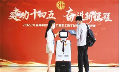 在福建省福州市數(shù)字經(jīng)濟(jì)產(chǎn)業(yè)職工數(shù)字城市應(yīng)用技能競賽決賽現(xiàn)場,工程師對巡檢防疫版機(jī)器人進(jìn)行檢測