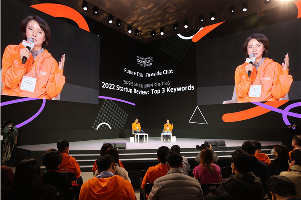 “COMEUP 2022”全球創(chuàng)業(yè)大會開幕式9日在韓國舉行。圖為韓國中小風(fēng)險企業(yè)部長官李永(右)在開幕式上進(jìn)行主題討論。韓國中小風(fēng)險企業(yè)部供圖