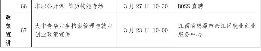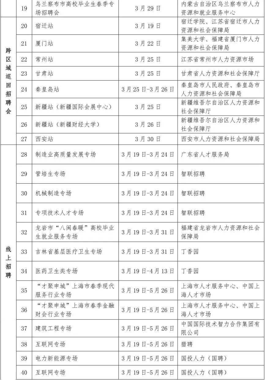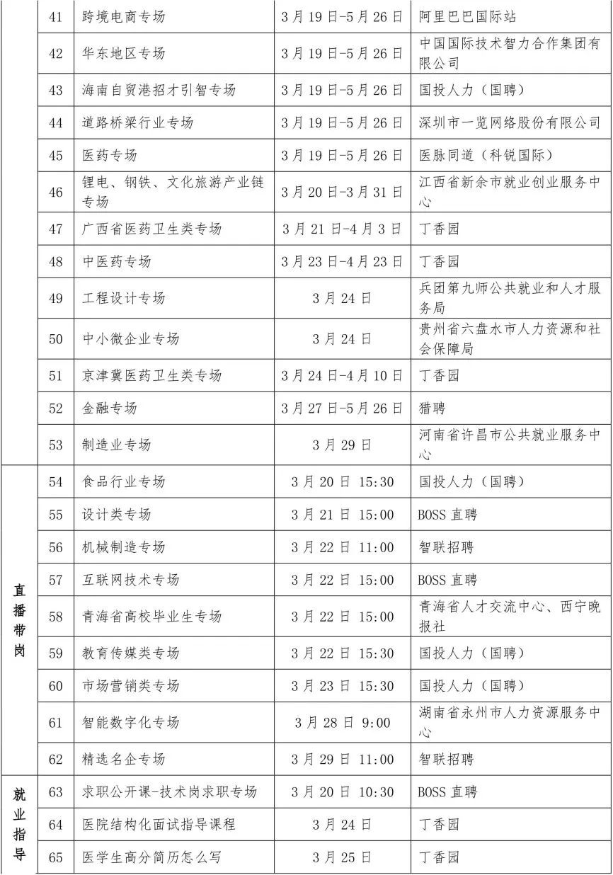 首期(3月19日-3月29日)推出67場特色服務(wù)活動。包括19場線下專場招聘會,8場跨區(qū)域巡回招聘會,制造業(yè)、醫(yī)藥衛(wèi)生、互聯(lián)網(wǎng)、電力新能源、跨境電商、海南自貿(mào)區(qū)等26場不同行業(yè)、區(qū)域線上專場招聘會,9場直播帶崗活動,4場就業(yè)指導(dǎo)直播(錄播),1場政策宣講直播。