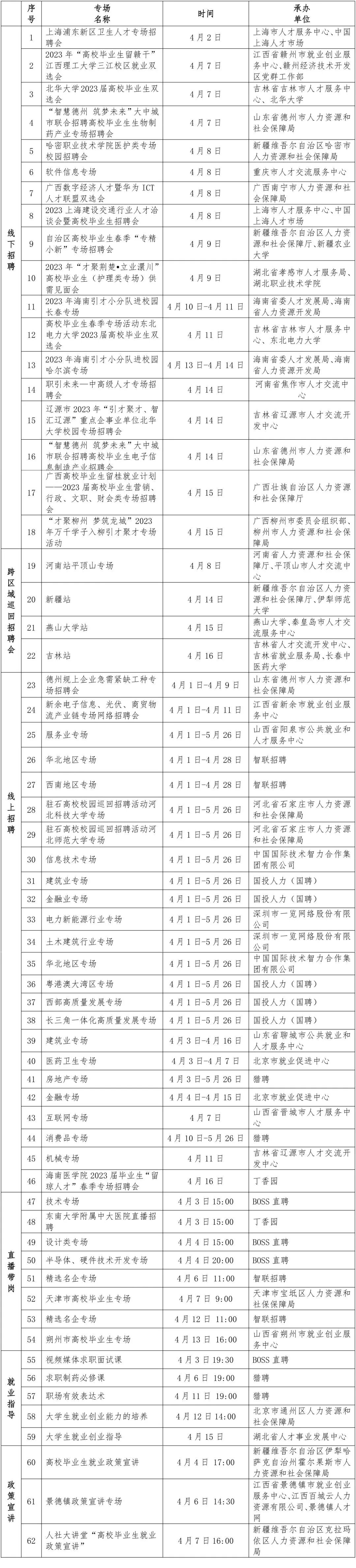 人力資源社會保障部職引未來—2023年大中城市聯(lián)合招聘高校畢業(yè)生春季專場第二批(4月1日-4月16日)推出62場特色服務(wù)活動,包括18場線下專場招聘會,4場跨區(qū)域巡回招聘會,24場不同行業(yè)、區(qū)域線上專場招聘會,8場直播帶崗活動,5場就業(yè)指導(dǎo)直播(錄播),3場政策宣講直播。