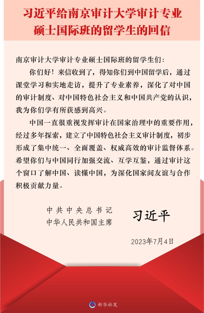 習近平在回信中說,得知你們到中國留學后,通過課堂學習和實地走訪,提升了專業(yè)素養(yǎng),深化了對中國的審計制度、對中國特色社會主義和中國共產(chǎn)黨的認識,我為你們學有所獲感到高興。