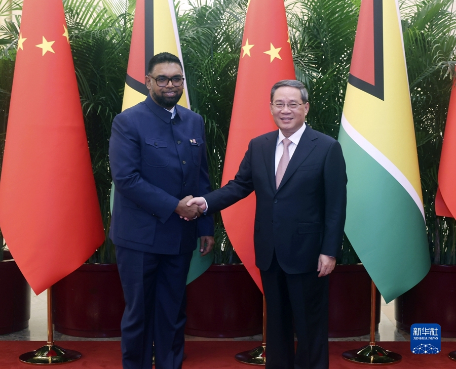7月30日下午,國(guó)務(wù)院總理李強(qiáng)在北京人民大會(huì)堂會(huì)見來華出席第31屆世界大學(xué)生夏季運(yùn)動(dòng)會(huì)開幕式并訪華的圭亞那總統(tǒng)阿里。新華社記者 劉衛(wèi)兵 攝