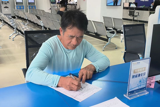 黎先生在工作人員的指導下填寫業(yè)務表格。黃健滔攝