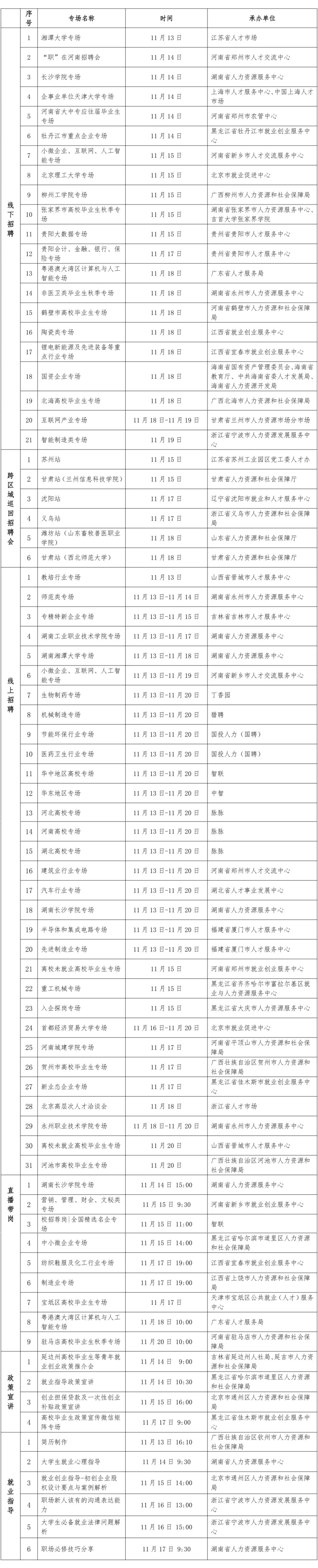 人力資源社會保障部2023年大中城市聯(lián)合招聘高校畢業(yè)生秋季專場活動近期將推出第四批共77場特色服務活動。包括智能制造類、互聯(lián)網產業(yè)、陶瓷類等21場線下專場招聘會,6場跨區(qū)域巡回招聘會,教培行業(yè)、生物制藥、機械制造等31場線上專場招聘會,9場直播帶崗活動,4場政策宣講直播(錄播)課以及6場就業(yè)指導直播(錄播)課。