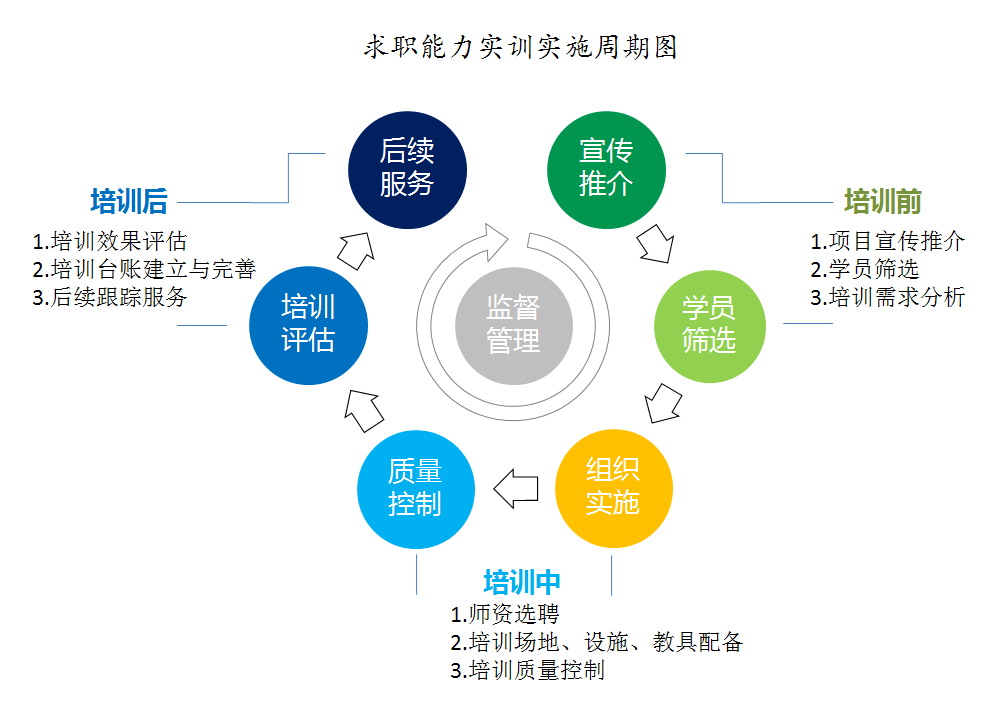 第八條 求職能力實(shí)訓(xùn)學(xué)員班培訓(xùn)分為培訓(xùn)前、培訓(xùn)中、培訓(xùn)后三個(gè)階段,培訓(xùn)周期包括宣傳推介、學(xué)員篩選、組織實(shí)施、質(zhì)量控制、培訓(xùn)評(píng)估、后續(xù)服務(wù)、監(jiān)督管理,監(jiān)督管理貫穿實(shí)施周期的全過(guò)程。