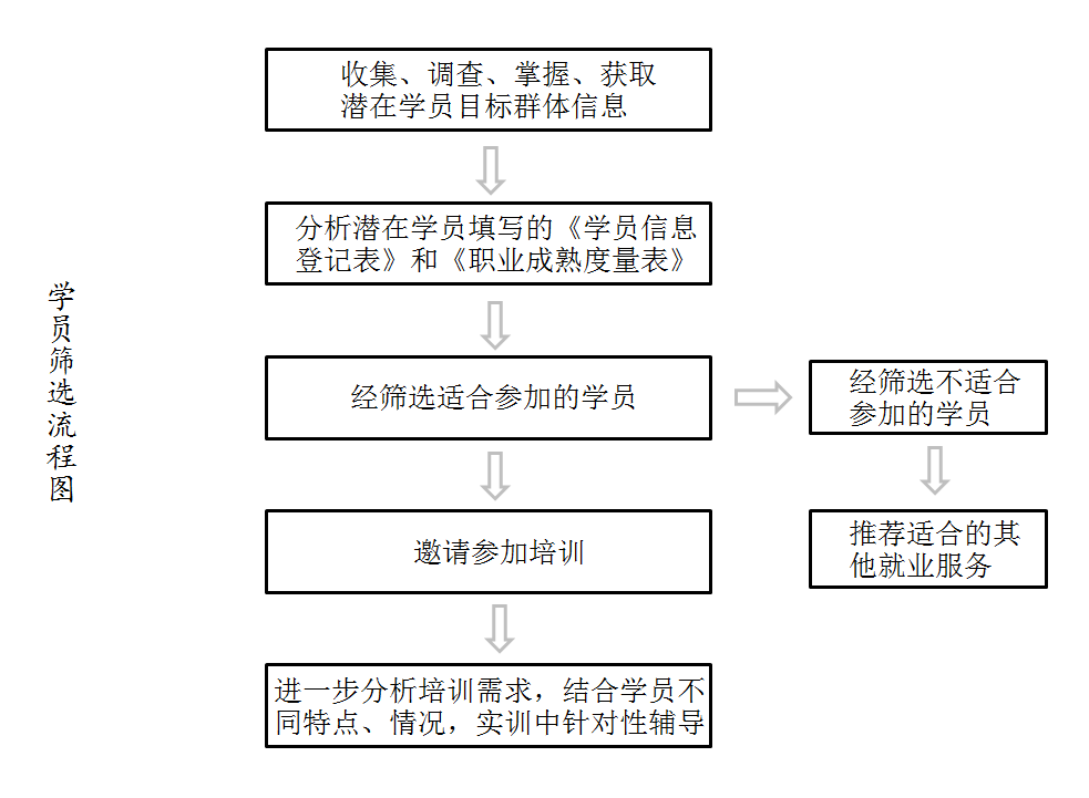 第十條 學(xué)員培訓(xùn)周期第二步,學(xué)員篩選,指培訓(xùn)主辦單位綜合考慮社會(huì)需求、學(xué)員實(shí)際情況選擇學(xué)員班學(xué)員。公共就業(yè)人才服務(wù)機(jī)構(gòu)、培訓(xùn)機(jī)構(gòu)、高校、用人單位、街道(社區(qū))間應(yīng)加強(qiáng)協(xié)調(diào)配合,注重調(diào)查、收集、掌握當(dāng)?shù)厍嗄耆后w勞動(dòng)力基礎(chǔ)數(shù)據(jù)信息、產(chǎn)業(yè)用工需求信息,針對(duì)性獲取潛在目標(biāo)學(xué)員。根據(jù)意向?qū)W員填寫的《學(xué)員信息登記表》和《職業(yè)成熟度量表》,對(duì)目標(biāo)學(xué)員進(jìn)行篩選及培訓(xùn)需求分析。