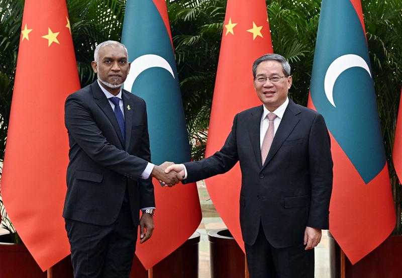 1月11日上午,國務(wù)院總理李強(qiáng)在北京人民大會(huì)堂會(huì)見來華進(jìn)行國事訪問的馬爾代夫總統(tǒng)穆伊茲。新華社記者 殷博古 攝
