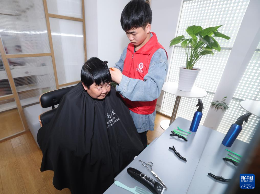 4月7日,在浙江省金華市金東區(qū)多湖街道金都美地社區(qū)黨群服務(wù)中心,金華市悅欣社會(huì)工作發(fā)展服務(wù)中心的理發(fā)師鄧中敬給77歲的社區(qū)老人吳姣鳳修剪頭發(fā)。