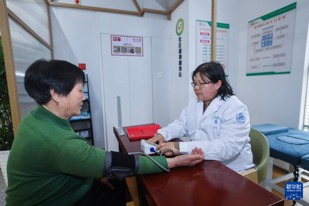 4月7日,在浙江省金華市金東區(qū)多湖街道金都美地社區(qū)黨群服務(wù)中心,多湖街道社區(qū)衛(wèi)生服務(wù)中心公衛(wèi)醫(yī)師錢燕娜給83歲的社區(qū)老人杜寶英量血壓。