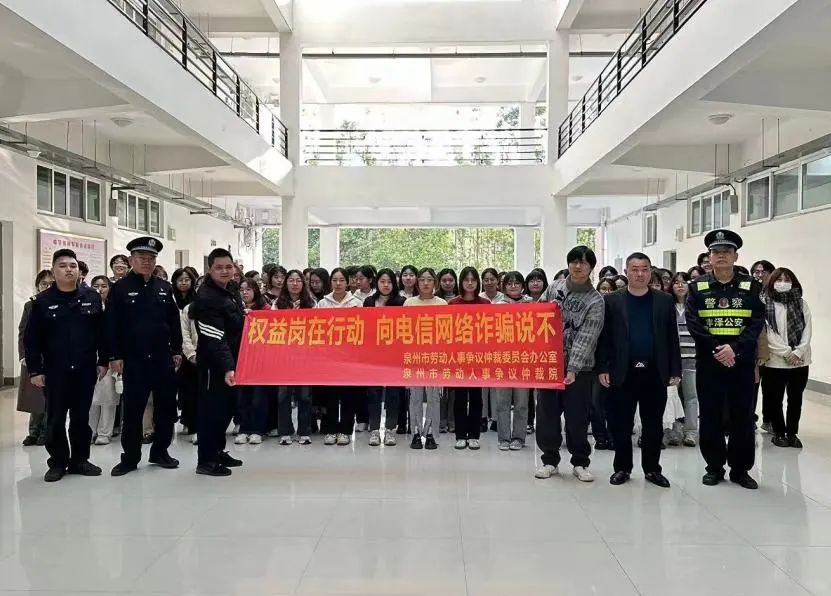 為深入貫徹落實(shí)共青團(tuán)中央、人力資源和社會(huì)保障部等15個(gè)部門《“權(quán)益崗在行動(dòng):向電信網(wǎng)絡(luò)詐騙說不”專項(xiàng)活動(dòng)的通知》的要求,進(jìn)一步增強(qiáng)高校大學(xué)生在勞動(dòng)就業(yè)方面的法律風(fēng)險(xiǎn)防范意識(shí),護(hù)航大學(xué)生走好未來就業(yè)路,近日,福建省泉州市勞動(dòng)人事爭議仲裁辦(市勞動(dòng)人事爭議仲裁院)聯(lián)合后渚海防派出所走進(jìn)泉州師范學(xué)院,開展求職與就業(yè)權(quán)益維護(hù)宣講活動(dòng),進(jìn)一步增強(qiáng)在校大學(xué)生勞動(dòng)就業(yè)法律風(fēng)險(xiǎn)防范意識(shí)。