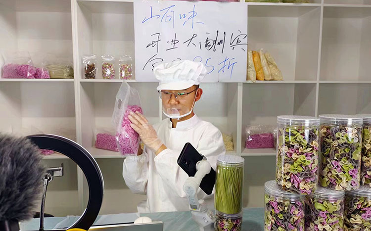 “我們公司生產(chǎn)的‘山有味’系列面條,在和面時加入曾家山原產(chǎn)的有機蔬菜汁,和成不同顏色的面團,繼而壓成面條,顏色多樣、營養(yǎng)健康,不僅有各種蔬菜直面,也有適合小朋友的蝴蝶面和卡通面等。”王嘉睿介紹,初期,公司生產(chǎn)的面條主要在本地農(nóng)家樂、廣元市及周邊區(qū)縣的超市、餐廳銷售;現(xiàn)在,按照“農(nóng)戶+車間+電商”思路,通過抖音平臺帶貨直播,已經(jīng)打開了更廣闊的市場。