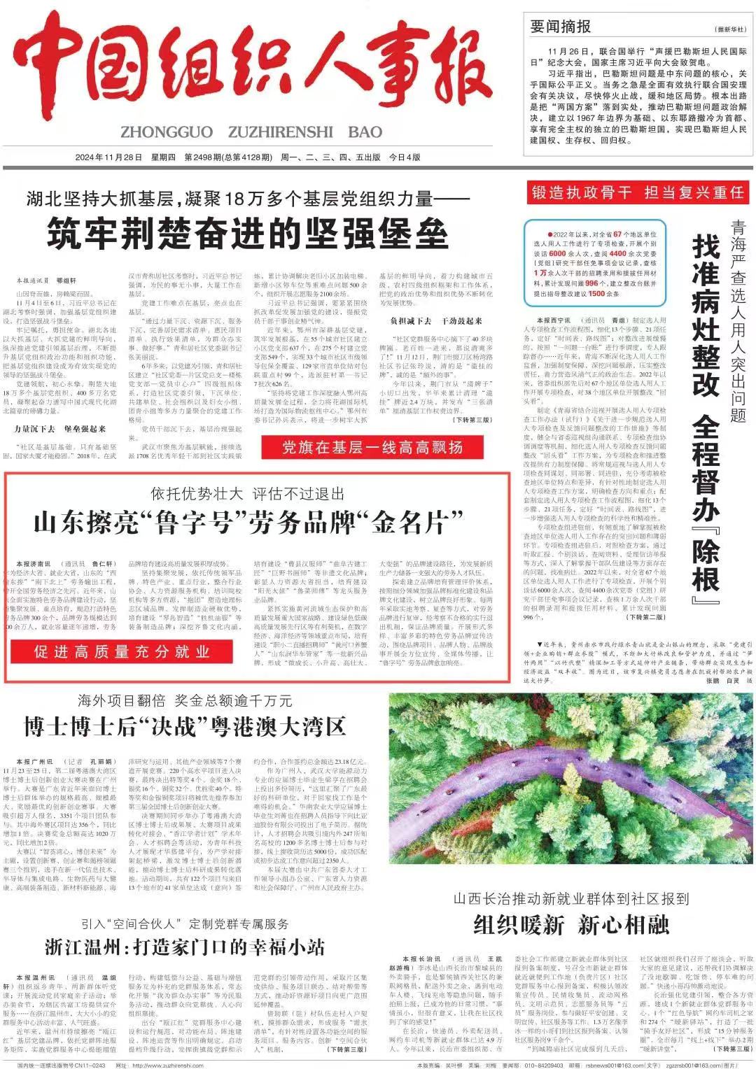 11月28日,中國組織人事報發(fā)表文章《山東擦亮“魯字號”勞務(wù)品牌“金名片”》,點(diǎn)贊山東通過實(shí)施特色勞務(wù)品牌建設(shè)行動,積極推動勞務(wù)輸出高質(zhì)量發(fā)展。