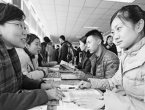 ? 日前,湖北省襄陽(yáng)市人社局舉辦2017年春季大學(xué)生人才招聘會(huì),共有292家用人單位進(jìn)場(chǎng)招賢納士,提供就業(yè)崗位8000多個(gè)。統(tǒng)計(jì)數(shù)字表明,由于大城市的房?jī)r(jià)越來(lái)越高,從襄陽(yáng)考出去的高校畢業(yè)生紛紛回流到本地就業(yè)創(chuàng)業(yè)。招聘會(huì)當(dāng)天共有1.2萬(wàn)人進(jìn)場(chǎng)交流,初步達(dá)成就業(yè)意向2750人。圖為求職的大學(xué)生(右)現(xiàn)場(chǎng)...