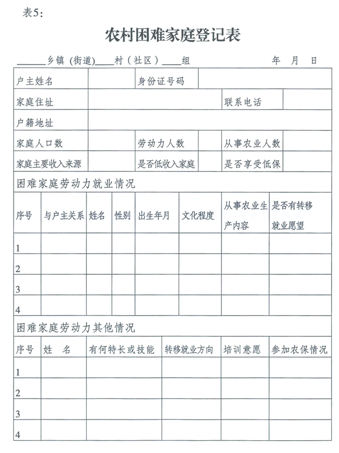 (一)申報。符合申報條件的農(nóng)民,持戶口簿、本人身份證向村級勞動就業(yè)社會保障服務(wù)站提出申請,填寫《農(nóng)村困難家庭登記表》(見表5)。未建立村級勞動就業(yè)社會保障服務(wù)站的,向鄉(xiāng)鎮(zhèn)(街道)勞動就業(yè)社會保障服務(wù)所提出申請。申報時分別提供以下材料: