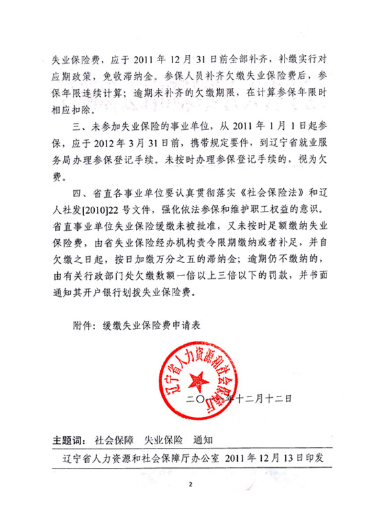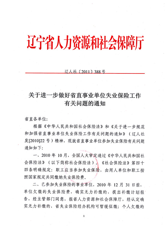 遼寧省關(guān)于進(jìn)一步做好省直事業(yè)單位失業(yè)保險工作有關(guān)問題的通知(遼人社[2011]388號)