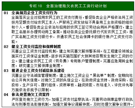 全面加強為農(nóng)民工服務工作。穩(wěn)定和擴大農(nóng)民工就業(yè)創(chuàng)業(yè),加強農(nóng)民工職業(yè)技能培訓。依法維護農(nóng)民工勞動保障權(quán)益,全面治理拖欠農(nóng)民工工資問題。推進戶籍制度改革,實施居住證制度,推動農(nóng)民工及其隨遷家屬逐步平等享受義務教育、公共衛(wèi)生服務等基本公共服務,有序推進農(nóng)民工市民化。推動開展新市民培訓,促進農(nóng)民工實現(xiàn)社會融合。開展農(nóng)民工市民化進程動態(tài)監(jiān)測。