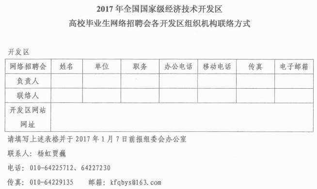 2.2017年全國國家級經(jīng)濟(jì)技術(shù)開發(fā)區(qū)高校畢業(yè)生網(wǎng)絡(luò)招聘會各開發(fā)區(qū)組織機(jī)構(gòu)聯(lián)絡(luò)方式(見附件2)