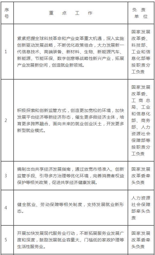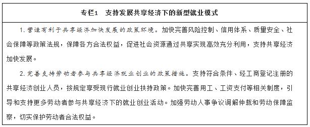大力發(fā)展新興產(chǎn)業(yè)新興業(yè)態(tài),不斷拓展新興就業(yè)領(lǐng)域。緊緊把握全球科技革命和產(chǎn)業(yè)變革重大機(jī)遇,深入實(shí)施創(chuàng)新驅(qū)動(dòng)發(fā)展戰(zhàn)略,不斷優(yōu)化政策組合,大力發(fā)展新一代信息技術(shù)、高端裝備、新材料、生物、新能源汽車、新能源、節(jié)能環(huán)保、數(shù)字創(chuàng)意等戰(zhàn)略性新興產(chǎn)業(yè),拓展產(chǎn)業(yè)發(fā)展新空間,創(chuàng)造就業(yè)新領(lǐng)域。推進(jìn)新產(chǎn)品、新服務(wù)應(yīng)用示范,加快產(chǎn)業(yè)化進(jìn)程,持續(xù)釋放吸納就業(yè)潛力。積極探索和創(chuàng)新監(jiān)管方式,創(chuàng)造更加寬松的環(huán)境,加快發(fā)展平臺(tái)經(jīng)濟(jì)等新經(jīng)濟(jì)形態(tài),催生更多微經(jīng)濟(jì)主體,培育更多跨界融合、面向未來(lái)的就業(yè)創(chuàng)業(yè)沃土,開(kāi)發(fā)更多新型就業(yè)模式。編制出臺(tái)共享經(jīng)濟(jì)發(fā)展指南,通過(guò)放寬市場(chǎng)準(zhǔn)入、創(chuàng)新監(jiān)管手段、引導(dǎo)多方治理等優(yōu)化環(huán)境,完善消費(fèi)者權(quán)益保護(hù)等相關(guān)政策,促進(jìn)共享經(jīng)濟(jì)健康發(fā)展。健全就業(yè)、勞動(dòng)保障等相關(guān)制度,支持發(fā)展就業(yè)新形態(tài)。