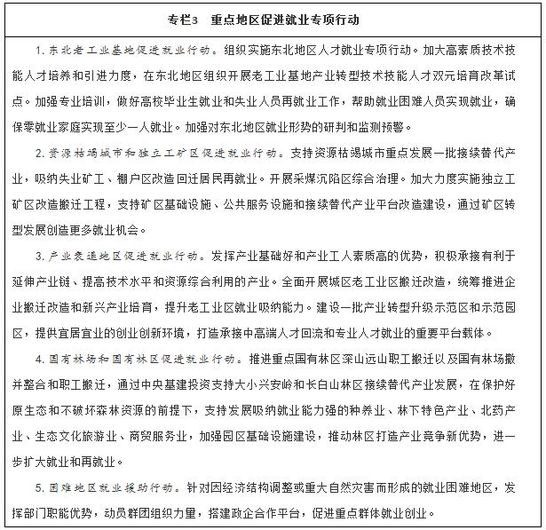 加快困難地區(qū)脫困步伐,創(chuàng)造更多就地就近就業(yè)機(jī)會(huì)。指導(dǎo)和推動(dòng)資源枯竭城市等困難地區(qū)培育發(fā)展勞動(dòng)密集型接續(xù)產(chǎn)業(yè)。研究制定支持產(chǎn)業(yè)衰退地區(qū)振興發(fā)展的指導(dǎo)意見(jiàn),通過(guò)落實(shí)財(cái)政、投資、金融、土地等支持政策,促進(jìn)產(chǎn)業(yè)衰退地區(qū)發(fā)展接續(xù)產(chǎn)業(yè),增強(qiáng)吸納就業(yè)能力。發(fā)揮區(qū)域比較優(yōu)勢(shì),引導(dǎo)符合條件的勞動(dòng)密集型企業(yè)特別是高附加值的勞動(dòng)密集型企業(yè)向中西部地區(qū)和東北地區(qū)轉(zhuǎn)移,創(chuàng)造更多就地就近就業(yè)機(jī)會(huì)。對(duì)去產(chǎn)能任務(wù)重、待崗職工多、失業(yè)風(fēng)險(xiǎn)大的地區(qū),開(kāi)展就業(yè)援助專項(xiàng)行動(dòng)。