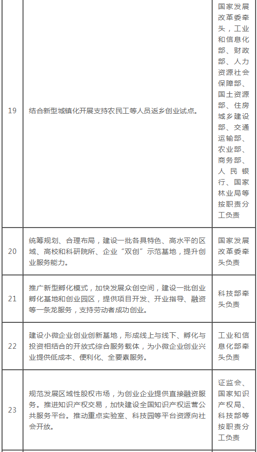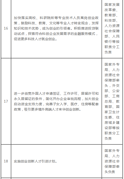 調(diào)動(dòng)勞動(dòng)者創(chuàng)業(yè)創(chuàng)富積極性。加快落實(shí)高校、科研院所等專業(yè)技術(shù)人員離崗創(chuàng)業(yè)政策,鼓勵(lì)科技、教育、文化等專業(yè)人才轉(zhuǎn)變觀念,發(fā)揮知識(shí)和技術(shù)優(yōu)勢(shì),成為創(chuàng)業(yè)的引領(lǐng)者。積極推進(jìn)投貸聯(lián)動(dòng)試點(diǎn),探索符合科創(chuàng)企業(yè)發(fā)展需求的金融服務(wù)模式,促進(jìn)更多科技人才就業(yè)創(chuàng)業(yè)。支持大中專畢業(yè)生轉(zhuǎn)變擇業(yè)觀念,自立自強(qiáng),成為創(chuàng)業(yè)的生力軍。研究實(shí)施留學(xué)人員回國(guó)創(chuàng)業(yè)創(chuàng)新啟動(dòng)支持計(jì)劃。進(jìn)一步放寬外國(guó)人才申請(qǐng)簽證、工作許可、居留許可和永久居留證的條件,簡(jiǎn)化開(kāi)辦企業(yè)審批流程,加大創(chuàng)業(yè)啟動(dòng)資金支持力度,完善子女入學(xué)、醫(yī)療、住房等配套政策,吸引更多境外高端人才來(lái)華創(chuàng)業(yè)創(chuàng)新。大力支持農(nóng)民工等人員返鄉(xiāng)下鄉(xiāng)創(chuàng)業(yè)。引導(dǎo)城鎮(zhèn)失業(yè)人員等其他各類人員以創(chuàng)業(yè)促就業(yè)。引導(dǎo)高校開(kāi)展創(chuàng)業(yè)創(chuàng)新訓(xùn)練計(jì)劃,激發(fā)大學(xué)生創(chuàng)業(yè)創(chuàng)新動(dòng)力。在全社會(huì)大力弘揚(yáng)創(chuàng)業(yè)風(fēng)尚,培育創(chuàng)業(yè)意識(shí),營(yíng)造鼓勵(lì)創(chuàng)業(yè)、寬容失敗的社會(huì)氛圍。
