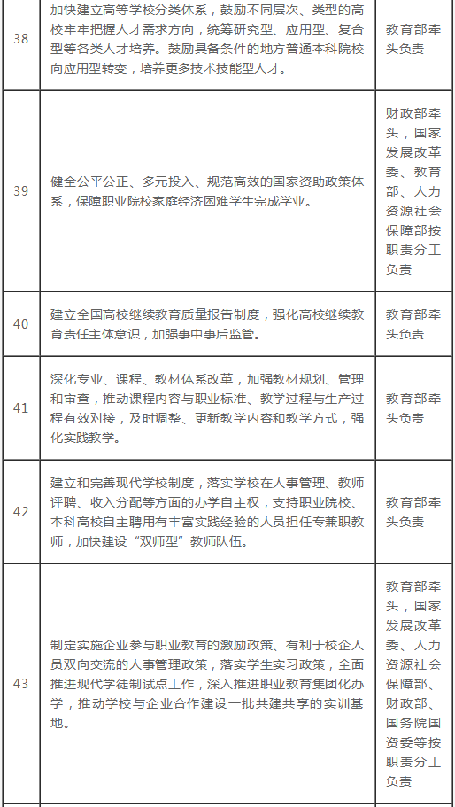 深化教學(xué)改革。推動(dòng)職業(yè)院校、本科高校與行業(yè)企業(yè)共同實(shí)施全流程協(xié)同育人,共同開(kāi)展教育教學(xué)、組織質(zhì)量評(píng)價(jià)。全面建立職業(yè)院校教學(xué)工作診斷與改進(jìn)制度。建立全國(guó)高校繼續(xù)教育質(zhì)量報(bào)告制度,強(qiáng)化高校繼續(xù)教育責(zé)任主體意識(shí),加強(qiáng)事中事后監(jiān)管。深化專業(yè)、課程、教材體系改革,加強(qiáng)教材規(guī)劃、管理和審查,推動(dòng)課程內(nèi)容與職業(yè)標(biāo)準(zhǔn)、教學(xué)過(guò)程與生產(chǎn)過(guò)程有效對(duì)接,及時(shí)調(diào)整、更新教學(xué)內(nèi)容和教學(xué)方式,強(qiáng)化實(shí)踐教學(xué)。建立和完善現(xiàn)代學(xué)校制度,落實(shí)學(xué)校在人事管理、教師評(píng)聘、收入分配等方面的辦學(xué)自主權(quán),支持職業(yè)院校、本科高校自主聘用有豐富實(shí)踐經(jīng)驗(yàn)的人員擔(dān)任專兼職教師,加快建設(shè)“雙師型”教師隊(duì)伍。制定實(shí)施企業(yè)參與職業(yè)教育的激勵(lì)政策、有利于校企人員雙向交流的人事管理政策,落實(shí)學(xué)生實(shí)習(xí)政策,全面推進(jìn)現(xiàn)代學(xué)徒制試點(diǎn)工作,深入推進(jìn)職業(yè)教育集團(tuán)化辦學(xué),推動(dòng)學(xué)校與企業(yè)合作建設(shè)一批共建共享的實(shí)訓(xùn)基地。