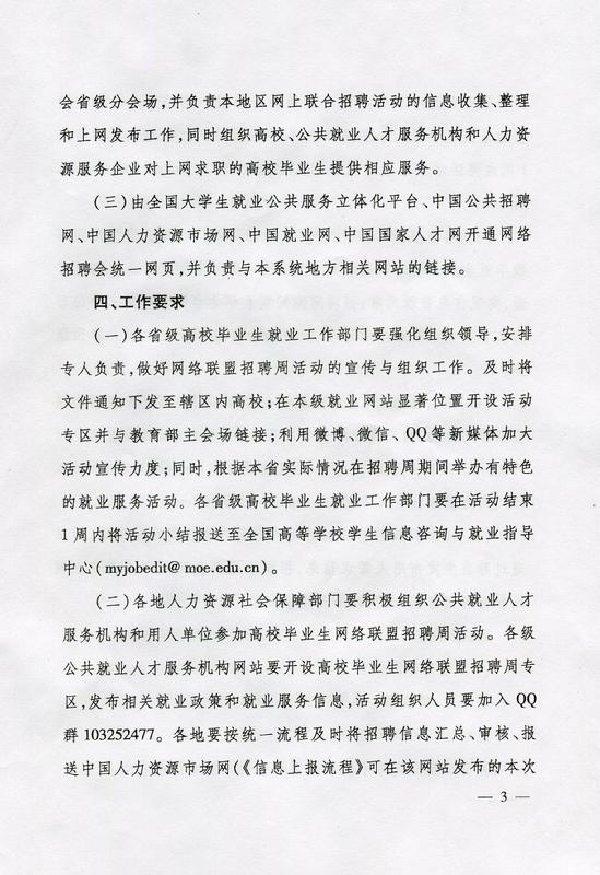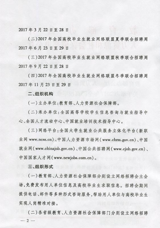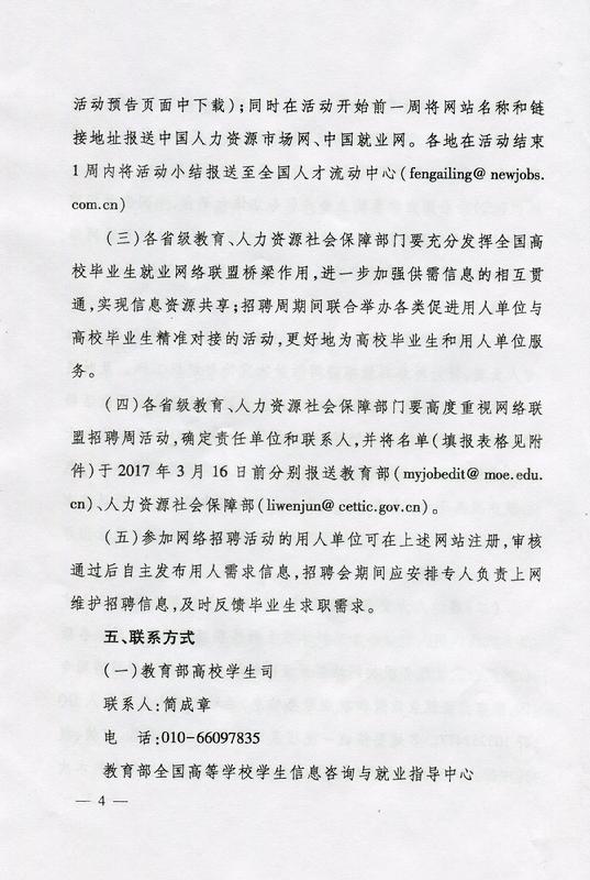 教育部辦公廳 人力資源社會保障部辦公廳關于舉辦2017年全國高校畢業(yè)生就業(yè)網(wǎng)絡聯(lián)盟招聘周活動的通知(教學廳函〔2017〕6號)