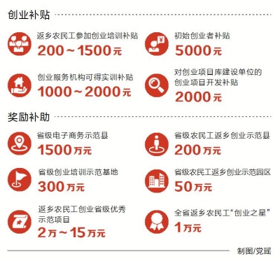 《措施》規(guī)定,推動(dòng)農(nóng)村電子商務(wù)發(fā)展帶動(dòng)農(nóng)民工返鄉(xiāng)創(chuàng)業(yè),對(duì)認(rèn)定為省級(jí)電子商務(wù)示范縣的,給予每縣1500萬元的補(bǔ)助。農(nóng)民企業(yè)家返鄉(xiāng)創(chuàng)業(yè)項(xiàng)目享受與外地客商同等優(yōu)惠政策,對(duì)引進(jìn)資金和技術(shù)的,按當(dāng)?shù)卣猩桃Y相關(guān)政策給予獎(jiǎng)勵(lì)。農(nóng)民工返鄉(xiāng)創(chuàng)辦的小微企業(yè),符合有關(guān)政策規(guī)定的,減免相關(guān)稅費(fèi)。