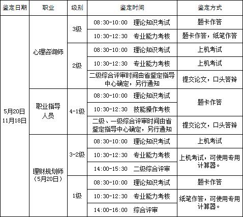 (二)全省統(tǒng)一鑒定時(shí)間是5月20日和11月18日,具體職業(yè)等級(jí)和安排見(jiàn)附件2。