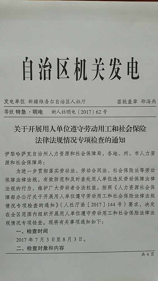 新疆維吾爾自治區(qū)人社廳關(guān)于開展用人單位遵守勞動用工和社會保險(xiǎn)法律法規(guī)情況專項(xiàng)檢查的通知