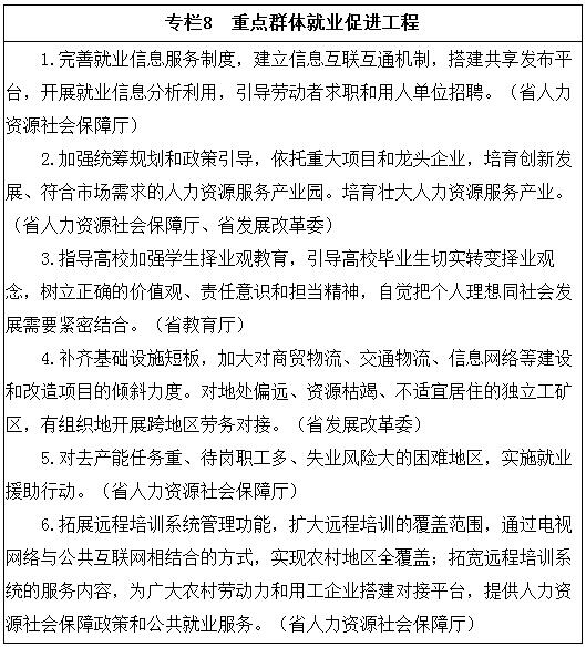 “十三五”期間,重點實施就業(yè)崗位開發(fā)、教育供給側結構性改革、勞動者技能提升、公共就業(yè)服務體系建設、“雙創(chuàng)”環(huán)境優(yōu)化、創(chuàng)業(yè)帶動就業(yè)、高校畢業(yè)生就業(yè)促進、重點群體就業(yè)促進等八大就業(yè)工程,實現(xiàn)就業(yè)規(guī)模穩(wěn)步擴大,就業(yè)質量進一步提升;創(chuàng)業(yè)環(huán)境顯著改善,帶動就業(yè)能力持續(xù)增強;人力資源結構不斷優(yōu)化,勞動者就業(yè)創(chuàng)業(yè)能力明顯提高的總體目標。到2020年要完成以下工作任務: