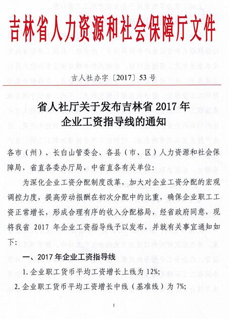 吉林省人力資源和社會(huì)保障廳關(guān)于發(fā)布吉林省2017年企業(yè)工資指導(dǎo)線的通知(吉人社辦字〔2017〕53號(hào))