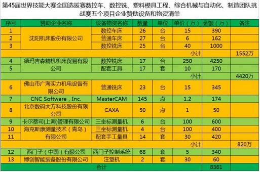 據(jù)悉,第45屆世賽國(guó)選賽最大宗的設(shè)備贊助會(huì)是由廣東省機(jī)械技師學(xué)院負(fù)責(zé)組織落實(shí),并舉行隆重簽約儀式。這是一個(gè)由包含了“國(guó)際一流競(jìng)賽,一流的企業(yè),一流的專家,一流的學(xué)院”共同參與的會(huì)議,其落實(shí)的贊助設(shè)備和有關(guān)物資支持額度達(dá)8300多萬元人民幣,這在目前是全國(guó)世賽國(guó)選賽中最大的一宗支持贊助。