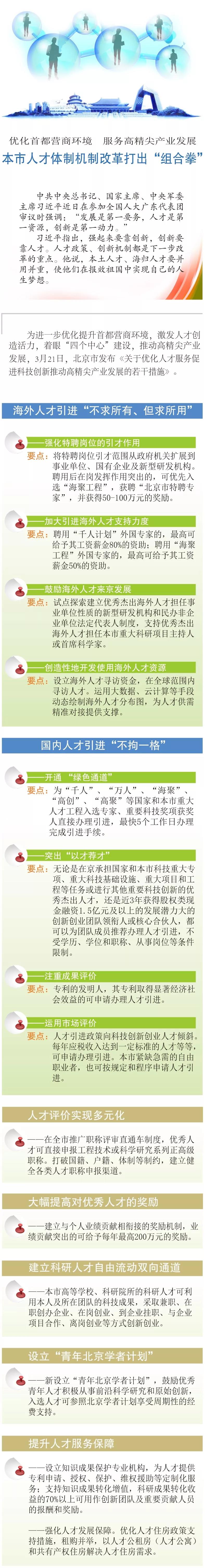 近日,北京市發(fā)布《關(guān)于優(yōu)化人才服務(wù)促進(jìn)科技創(chuàng)新推動(dòng)高精尖產(chǎn)業(yè)發(fā)展的若干措施》。這是北京推進(jìn)人才發(fā)展體制機(jī)制改革,優(yōu)化提升人才發(fā)展環(huán)境,在人才的引進(jìn)、評(píng)價(jià)、激勵(lì)、流動(dòng)、培養(yǎng)、服務(wù)保障等重要環(huán)節(jié)進(jìn)行的突破和創(chuàng)新。