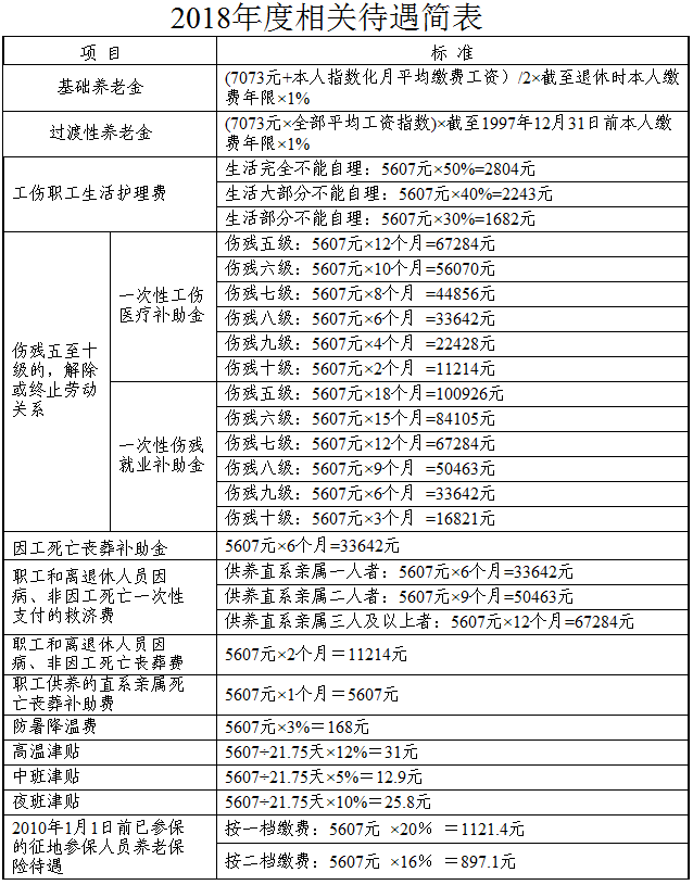 (二)2018年度工傷保險(xiǎn)、工資福利等待遇標(biāo)準(zhǔn),按本市職工月平均工資5607元計(jì)算,自2018年1月1日起執(zhí)行。具體標(biāo)準(zhǔn)見(jiàn)《2018年度相關(guān)待遇簡(jiǎn)表》(附件)。