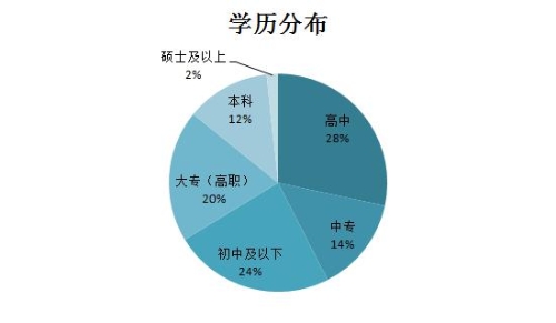 4、【學歷分布】問卷提交者中,受過中等學歷教育的占42.48%,其中:具有高中學歷583人,占28.37%;中專(技校、職高)290人,占14.11%;其他學歷的提交者分別為:初中及以下共489人,占23.8%;大專(高職)共402人,占19.56%;本科共256人,占12.46%;碩士及以上共35人,占1.7%。