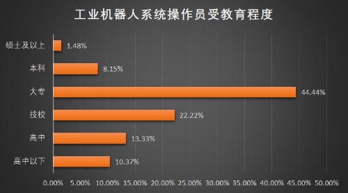 3、【學歷分布】44.44%的工業(yè)機器人系統(tǒng)操作員是專科學歷,1.48%為碩士研究生,45%的學歷為大專及以下。工業(yè)機器人系統(tǒng)操作員就業(yè)門檻低。