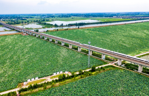 一列高鐵從曹老集鎮(zhèn)東海島生態(tài)園呼嘯駛過。淮上區(qū)委宣傳部供圖