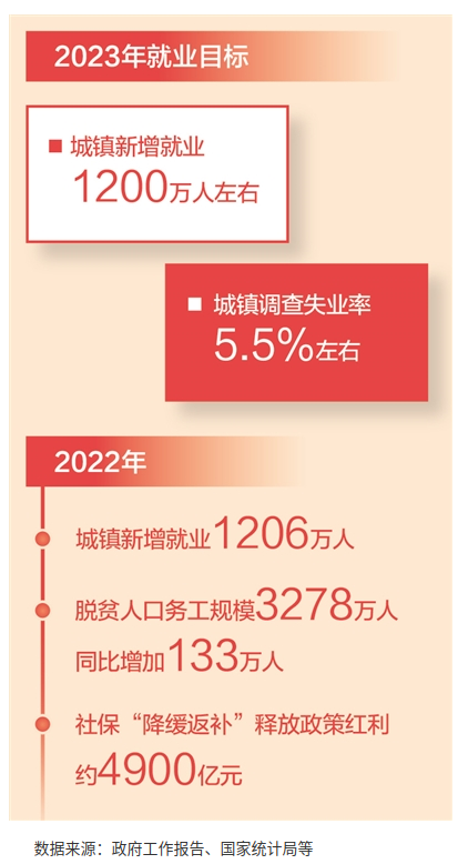 政府工作報告提出今年發(fā)展主要預(yù)期目標中,城鎮(zhèn)新增就業(yè)1200萬人左右,城鎮(zhèn)調(diào)查失業(yè)率5.5%左右。