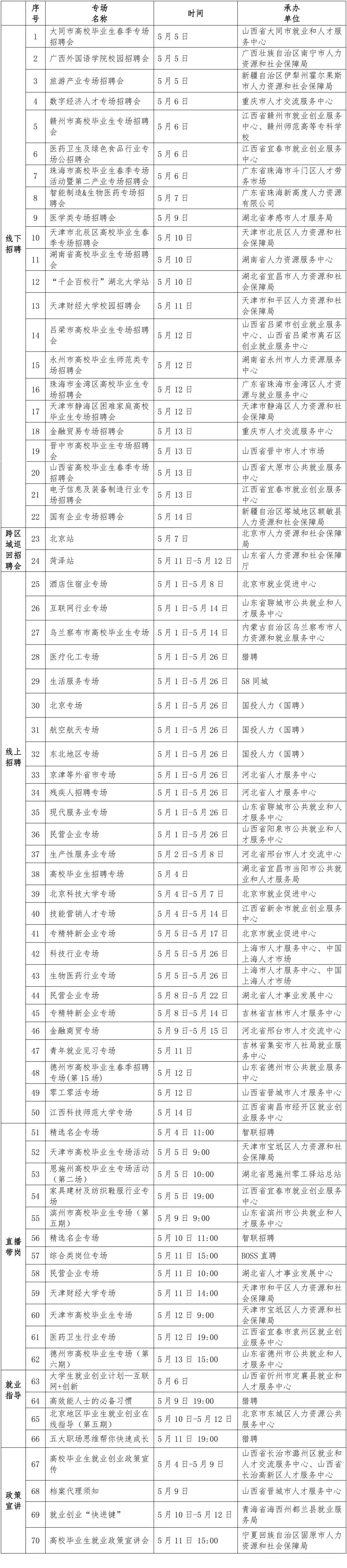 人力資源社會(huì)保障部職引未來—2023年大中城市聯(lián)合招聘高校畢業(yè)生春季專場(chǎng)第四批(5月1日-5月14日)推出70場(chǎng)特色服務(wù)活動(dòng)。包括22場(chǎng)線下專場(chǎng)招聘會(huì),2場(chǎng)跨區(qū)域巡回招聘會(huì),26場(chǎng)不同行業(yè)、區(qū)域線上專場(chǎng)招聘會(huì),12場(chǎng)直播帶崗活動(dòng),4場(chǎng)就業(yè)指導(dǎo)直播(錄播),4場(chǎng)政策宣講直播(錄播)。