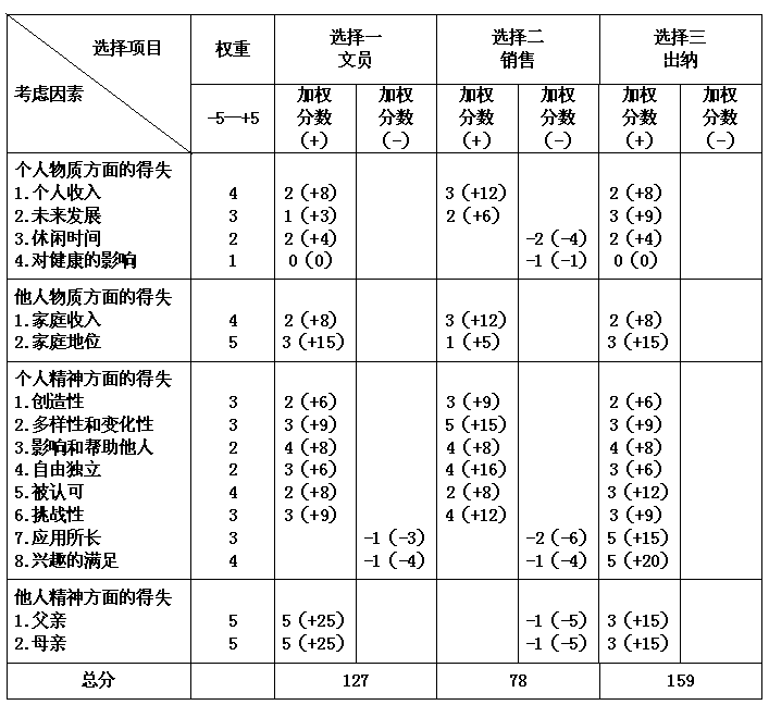 2、 求職決策平衡單:從個(gè)人、他人角度出發(fā),列出職業(yè)決策的考慮因素——物質(zhì)和精神的得失,給每一個(gè)因素以相對(duì)重要性的權(quán)重,對(duì)于備選職業(yè)方案,對(duì)照考慮因素給出分?jǐn)?shù),其中“得”以正數(shù)表示,“失”以負(fù)數(shù)表示,按總分進(jìn)行比較和排序,以確定目標(biāo)職業(yè)。
